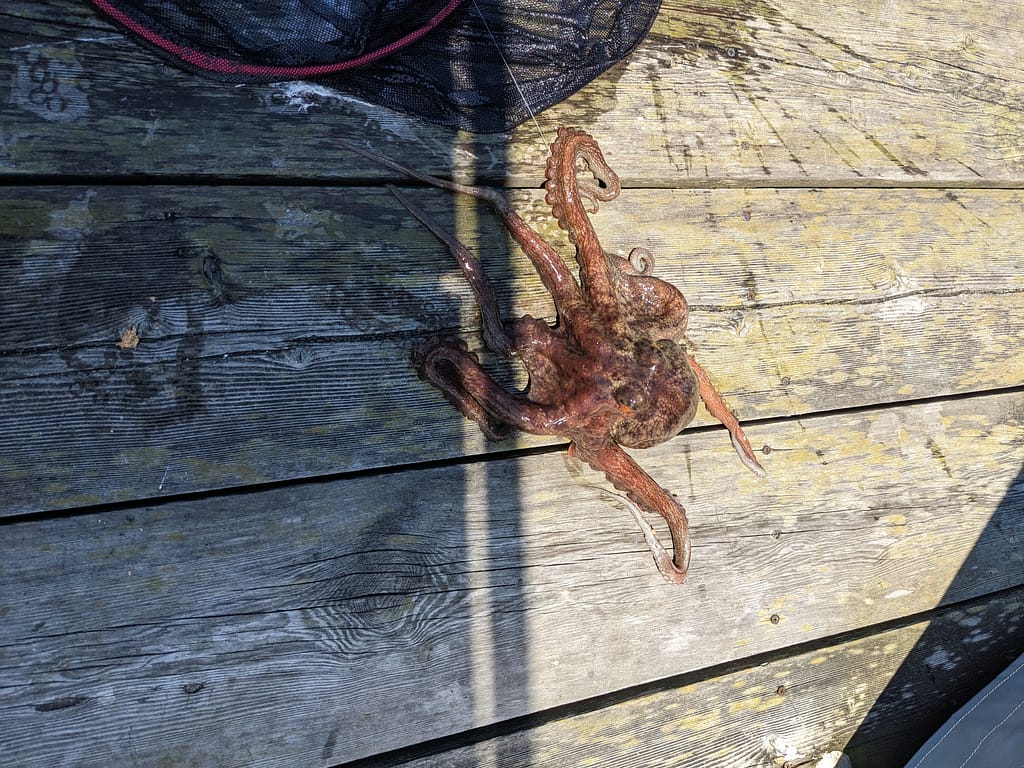 ぬーーーーーっと上がってきたタコさんは、針を足に引っ掛けながら筏の上を縦横無尽に歩き始めました。