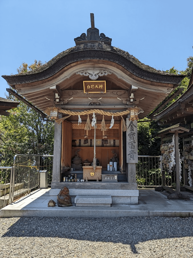 かわらけ投げの横には白巳大神様がお祀りされていました。弁才天の化身・遣いとされており、特に白蛇は財運や幸福をもたらすとされています。こちらにも、しっかりと手を合わせました。